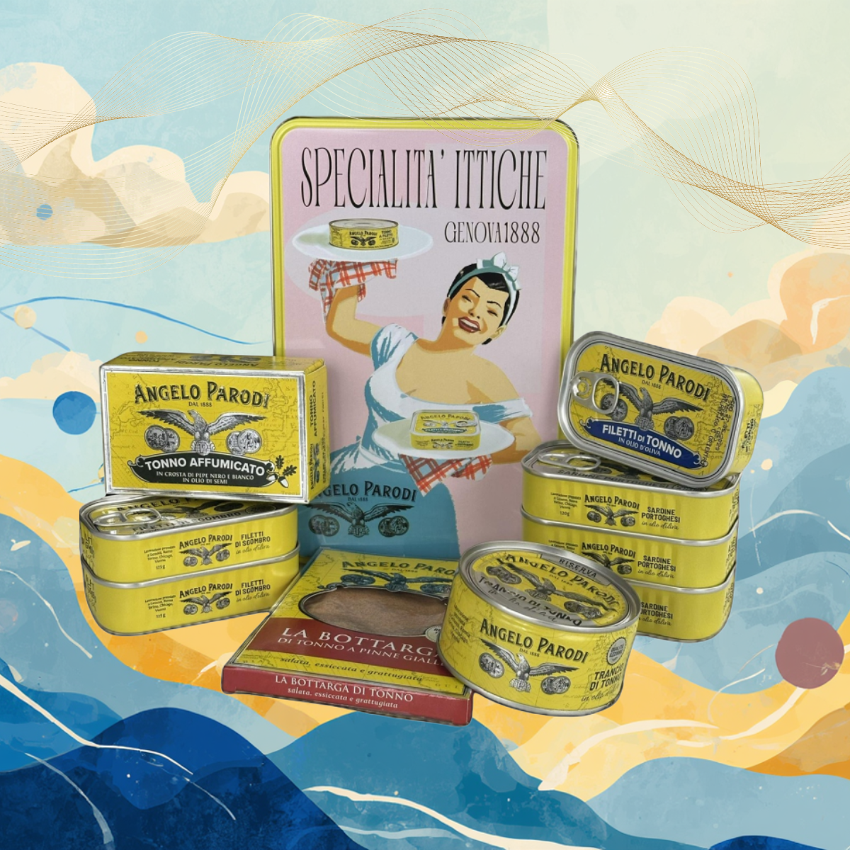 Elegantne Vintage stiilis plekk-karp, milles on lai valik Angelo Parodi ettevõtte tooteid.