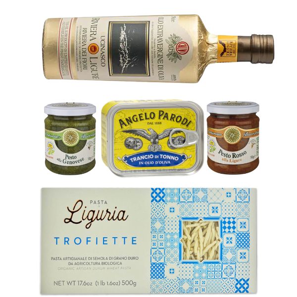Teemal “Liguuria Klassika” kinkepakk ühendab piirkonna kuulsaima pasta, ehtsa Genova pesto ja kõrgelt hinnatud DOP-oliiviõli – täiuslik kingitus gurmaanile, kes hindab kvaliteeti ja autentsust.