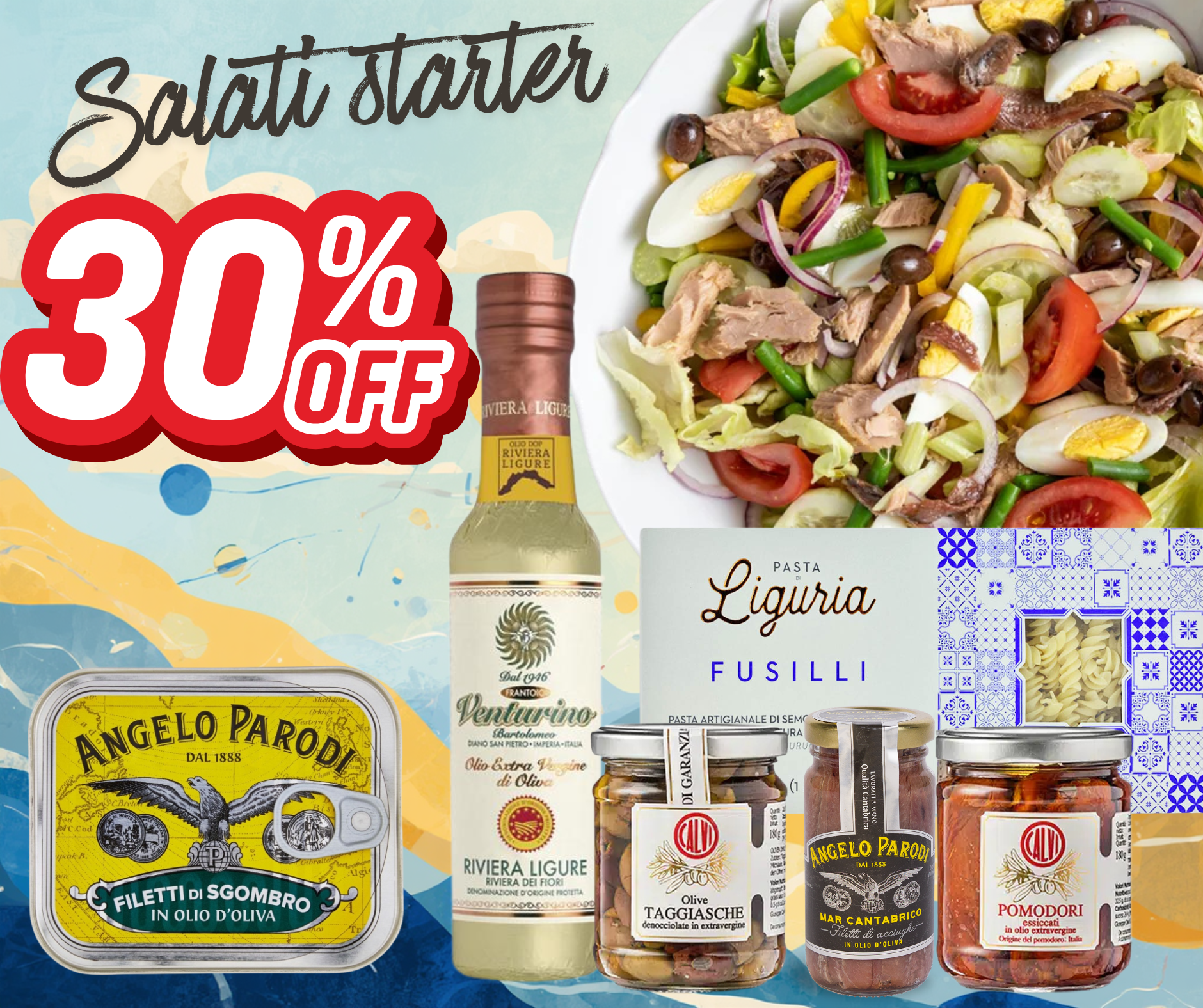 Salati Starter on hoolikalt kokku pandud komplekt autentsetest Itaalia toodetest, millega valmistad kiiresti ja lihtsalt maitserikka Vahemere stiilis salati. Komplekt ühendab kvaliteetse kala, Liguuria piirkonna klassikalised lisandid ja kõrgekvaliteedilise D.O.P. oliiviõli.